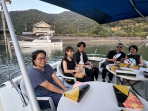 夜の海の上.静かに揺れる船の上空に花火が打ちあがる。一発また一発と夜空を彩る火の花が海面にも美しく反射して、揺らめく光の絨毯のよう。非日常の空間に心が解き放たれる。