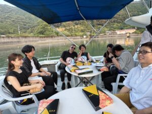 夜の海の上.静かに揺れる船の上空に花火が打ちあがる。一発また一発と夜空を彩る火の花が海面にも美しく反射して、揺らめく光の絨毯のよう。非日常の空間に心が解き放たれる。