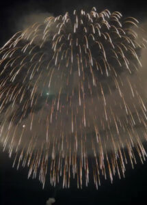 夜の海の上.静かに揺れる船の上空に花火が打ちあがる。一発また一発と夜空を彩る火の花が海面にも美しく反射して、揺らめく光の絨毯のよう。非日常の空間に心が解き放たれる。